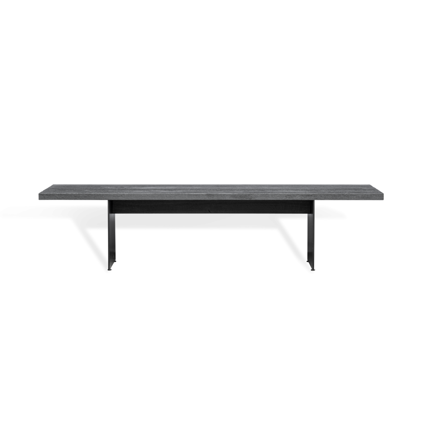 Bank mit Stahlwangenfüßen, pulverbeschichtet. Ergonomisch geformte Massivholz-Sitzfläche in Lamellenbauweise. Wangengestell mit Stellfüßen.