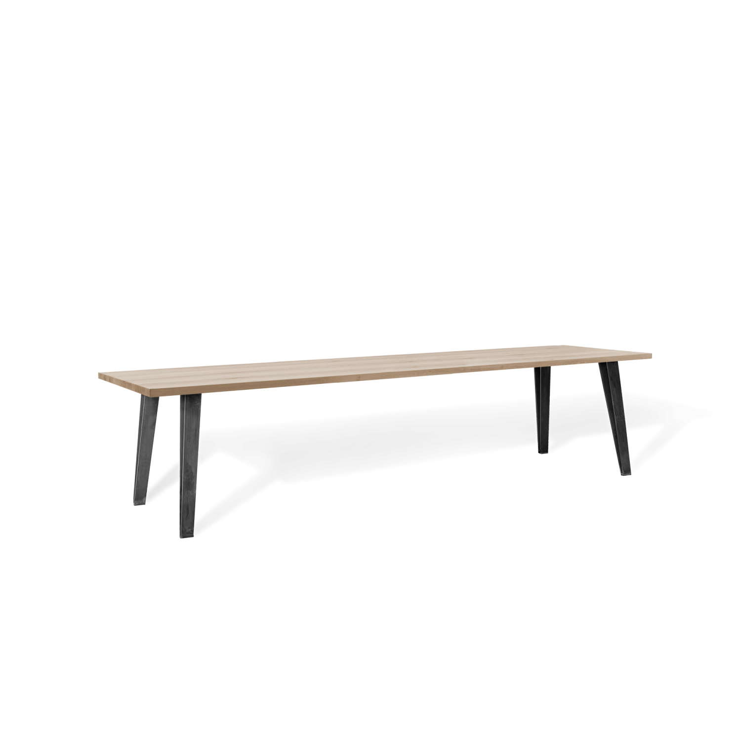 Tisch mit ausgestellten offenen Tischbeinen aus Flachstahl, pulverbeschichtet oder Roh-stahl geölt. Die Tischplatte in Massivholz zeigt sichtbare Naturmerkmale. Tischbeine mit Filzgleitern.